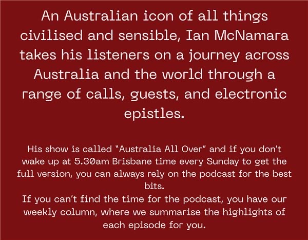 Disclaimer: ‘Australia All Over’ is a program produced and broadcast by the ABC Local Radio Network and hosted by Ian McNamara. Brisbane Suburbs Online News has no affiliation with Ian McNamara, the ABC, or the ‘Australia All Over’ program. This weekly review is an independent summary based on publicly available podcast transcripts and episodes. All original content and recordings remain the property of the ABC. Our summaries are written in our own words and are intended for commentary and review purposes only. Readers can listen to the full episodes via the official ABC platforms.