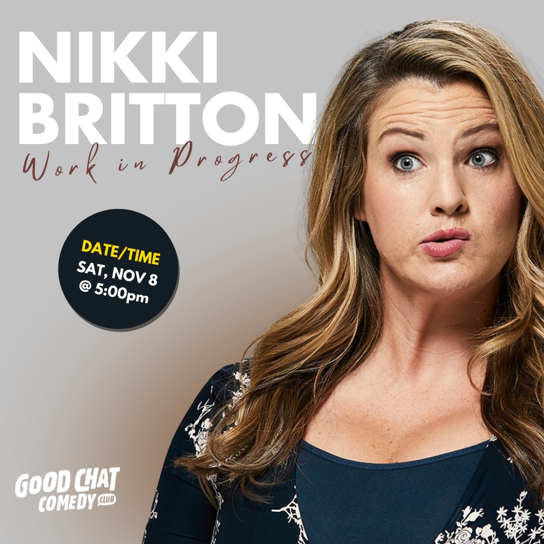 Comedian Nikki Britton is bringing a new “Work In Progress” show to the Good Chat Comedy Club. Known as a “joy bomb,” Britton will be testing out new material, sharing her sharp wit and chaotic life stories.